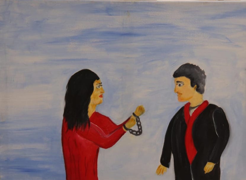 شعار السلام، ولوحة درب مؤدية إلى المنزل، تعبير عن توق للحرية، والالتحاق بالعائلة والاهل، وسجينة تتلوى ألماً من خلف القضبان، وهي تشاهد ولدَين يلعبان بحريّة، هل تجد فيهما حريتها، أم ترى فيها أبناءها؟ والتفسير مفتوح.