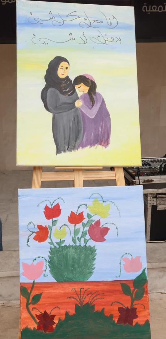 ثمة لوحة لطفلة تمسك بثوب أمها (السجينة افتراضاً) تقول لها: “أنا معك كل شيء.. أنا بدونك لا شيء"، وهي مطالبة بإعادة الأمهات السجينات إلى منازلهن، وأبنائهن.
