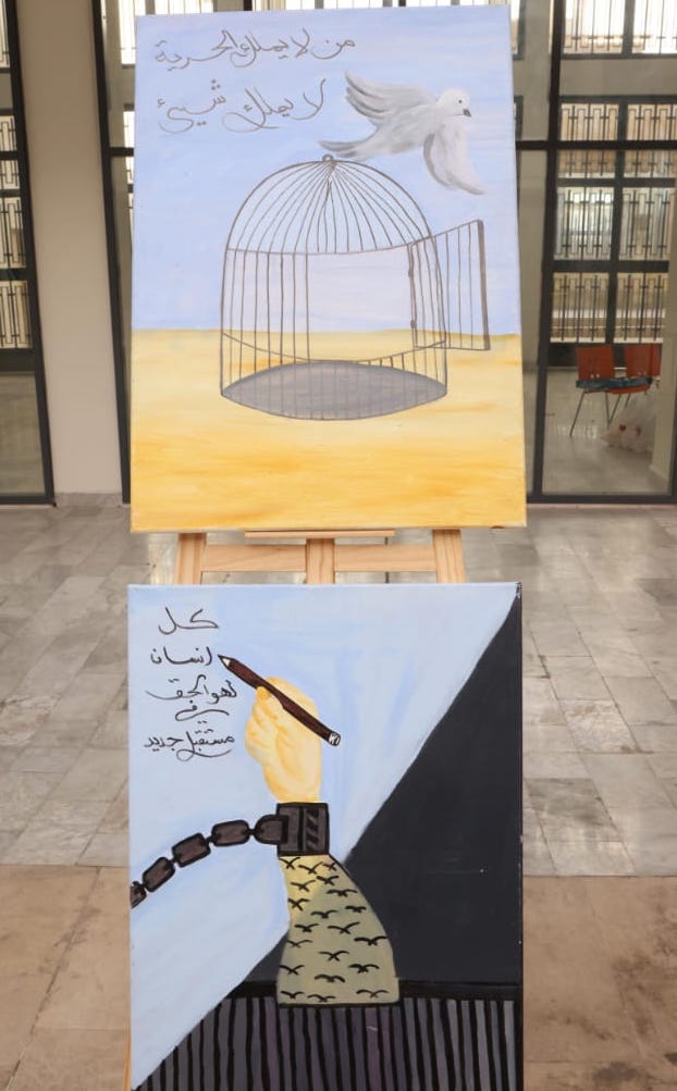 لوحة جسّدت نافذةً مفتوحةً على الحرية، وتحتها زهرة الحلم. وبلوحة رمزية، رسمت إحداهن رأساً مغروساً بشمعة مضيئة، هل هي الهداية؟ ربما.. وأخرى لطائر فتح باب القفص، وانطلق نحو حريته مع شعار "من لا يملك الحرية لا يملك شيئاً" وتحتها لوحة ليد تكتب: "لكل انسان الحق بمستقبل جديد"، أي إنها تتضمن مطالبة بإعطائها فرصة أخرى للحياة.