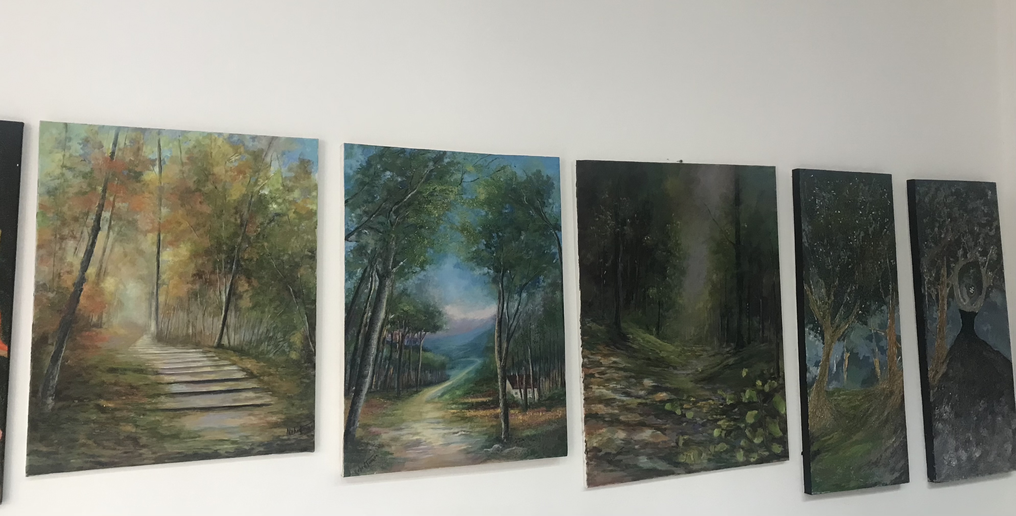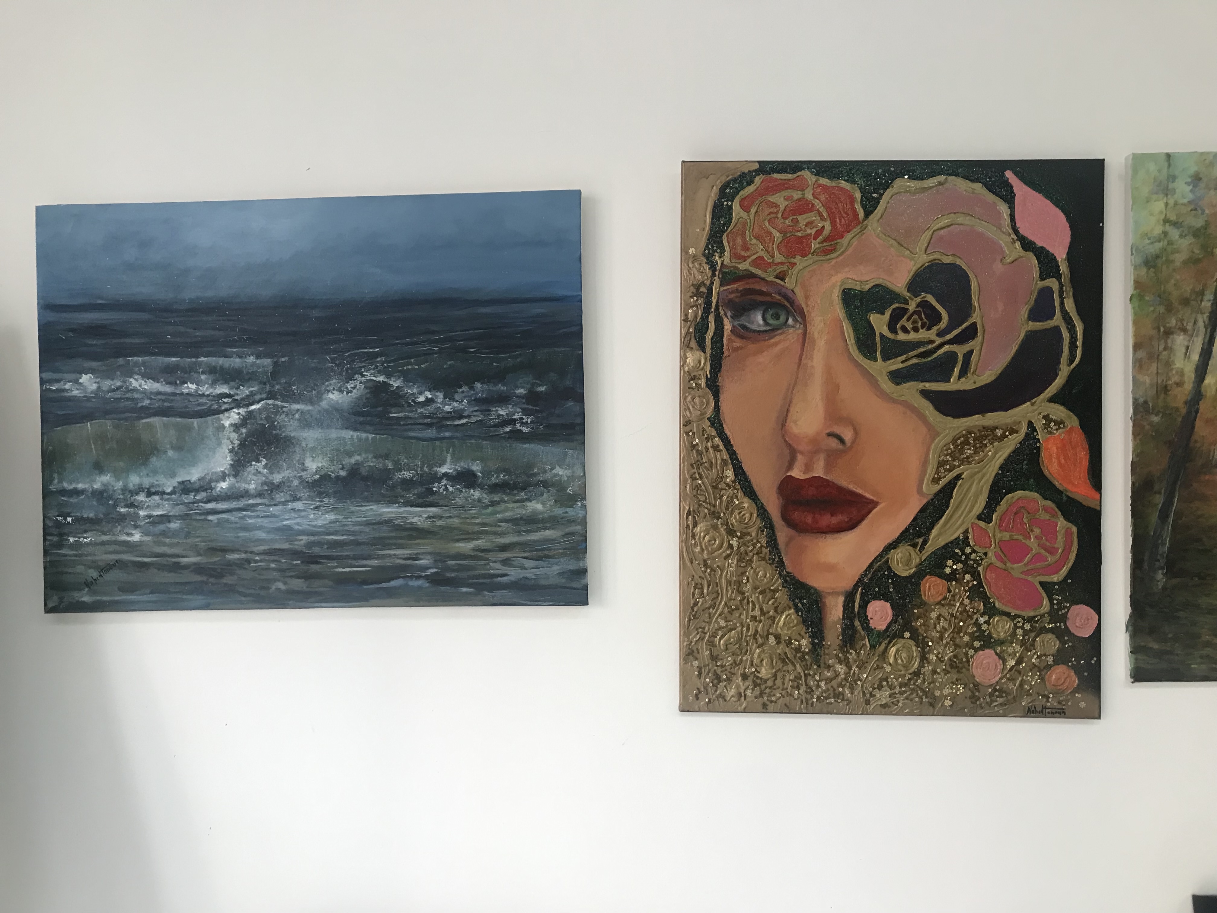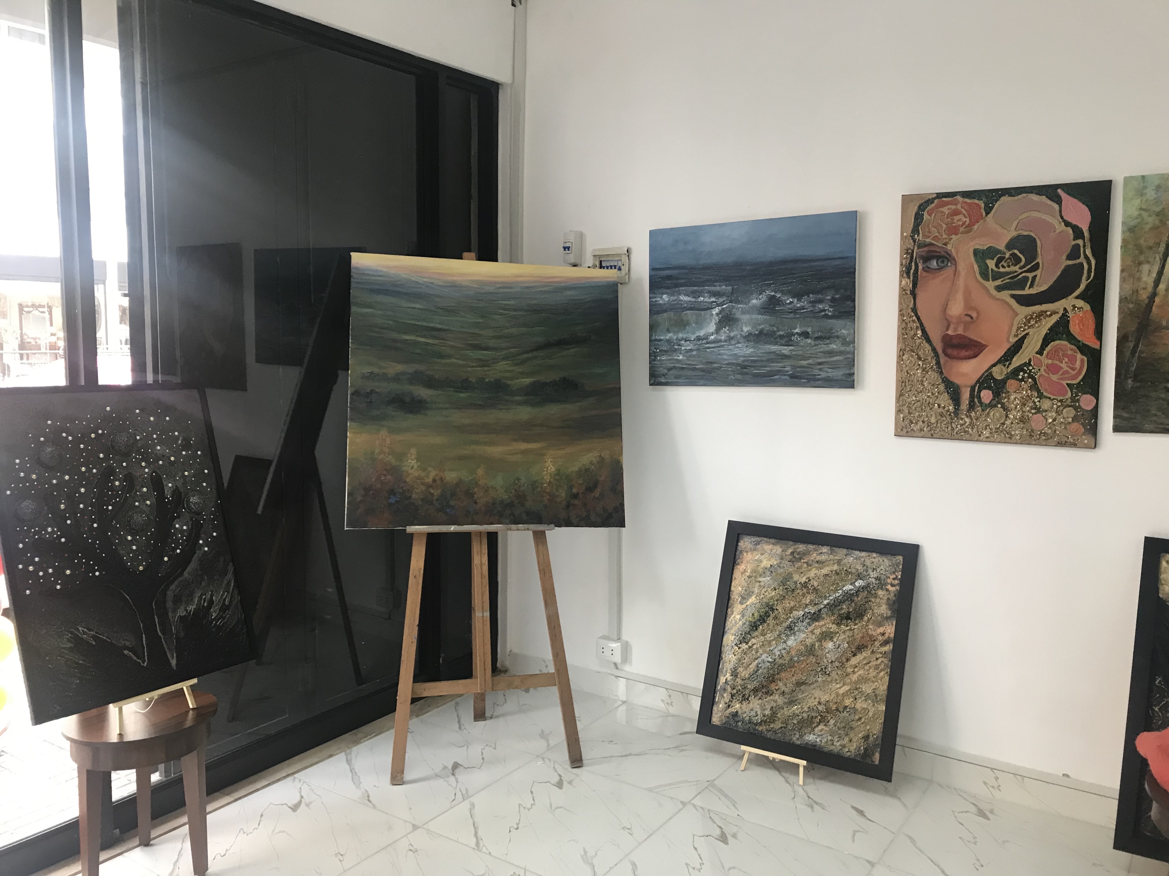 بعض اللوحات من ورود، وباقات زهور تجمع فكرتي الجمال والهندسة الداخلية، ولوحة مخصّصة للمرأة في عينها التحدي، وعمق النظرة.