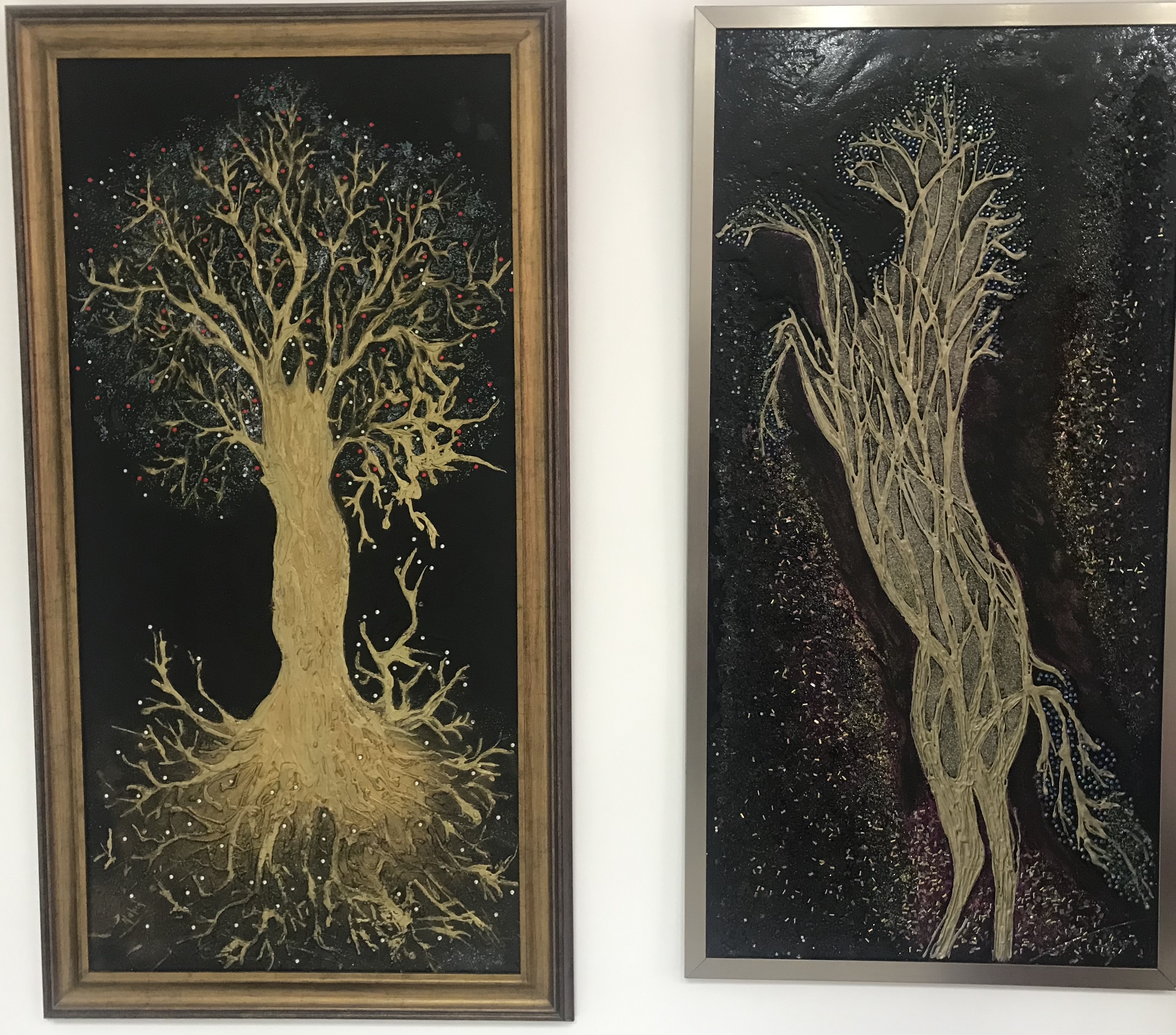 لوحات رمزية مثل شكل للحصان تعبّر به عن فكرة الشموخ، والتسامي، وشجرة متجذرة بقوة، واثقة من ثباتها، رافعة أذرعها في الفضاء كأنها تتحدى الأقدار، ويمكن فيها تلمّس رغبة أنثوية تعبر عن قوة المرأة، وضرورتها في الحياة، والكون.