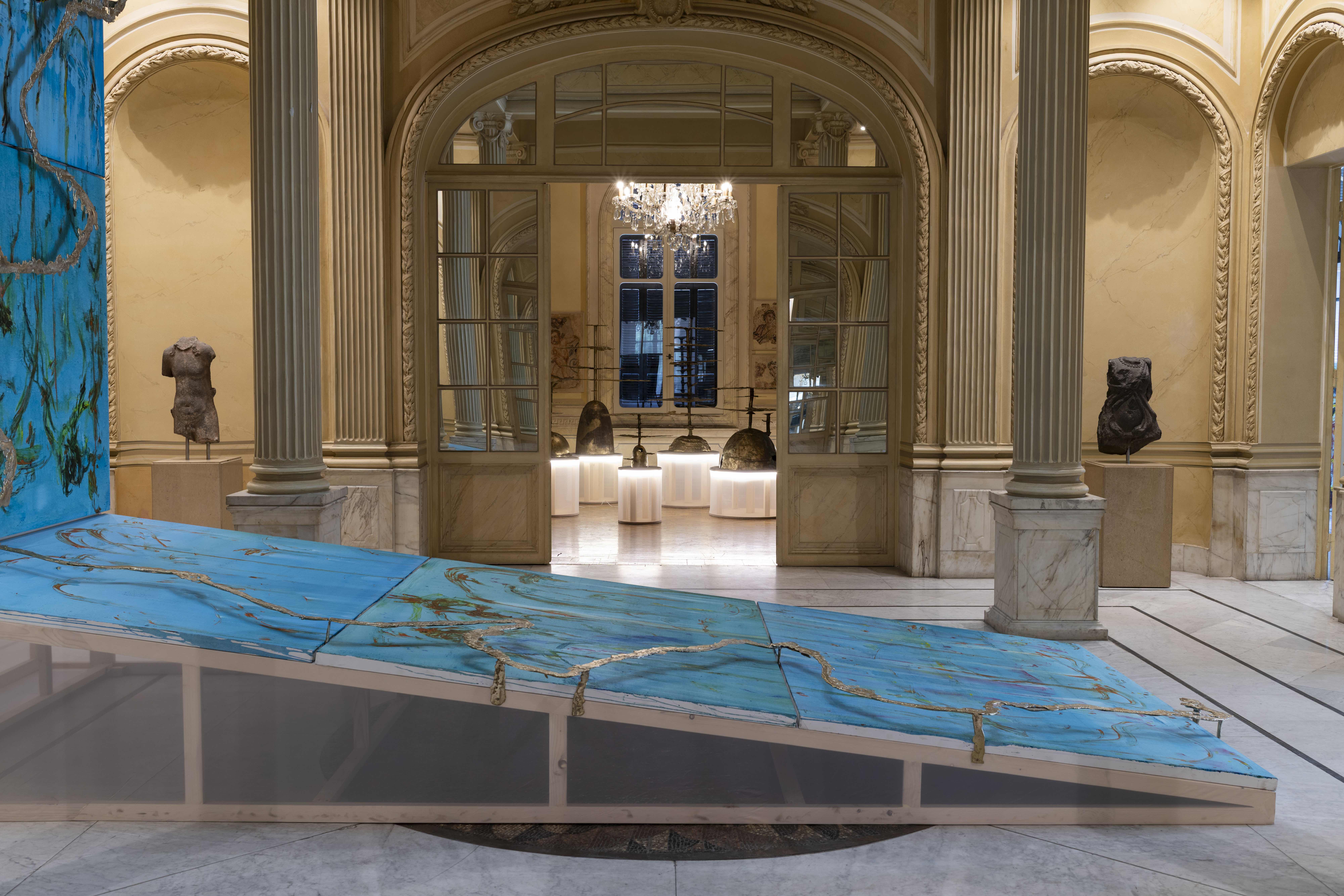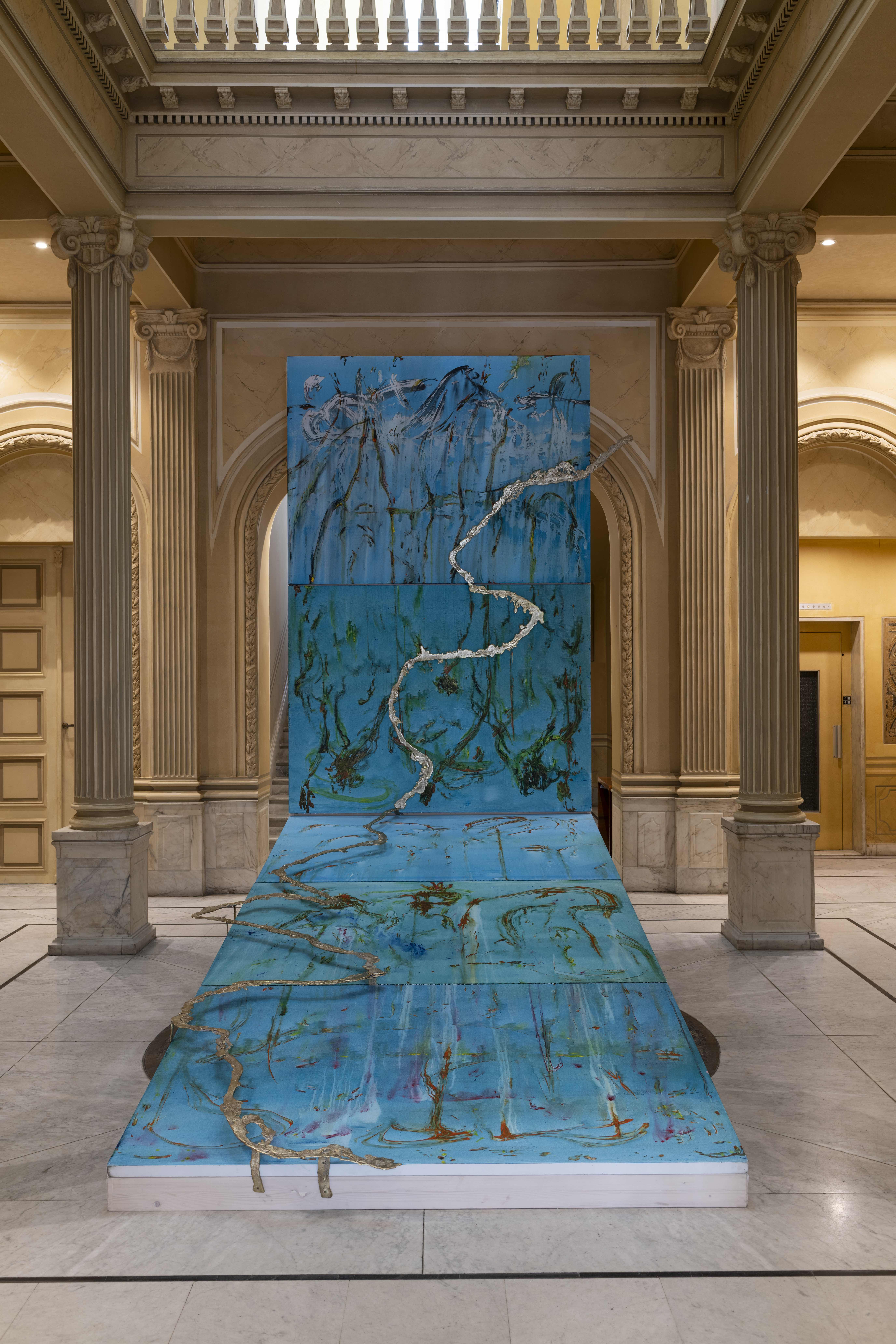 مذبح "خرائط ما بين البينين" (Cartographies of the In-Between)، يمكن فيه قراءة حركة متعاكسة بين الصعود والهبوط، كأنه يسعى لفتح ممر بين قطبين، ويتحوّل العبور إلى طقس. في هذا المذبح، يتجسد النزاع بين الرغبة والانتكاس تحت وطأة ظلام العالم الذي لم يترك كوّة نور نحو أمل يفترض أن يتحقق، لكن النكسات والخيبات حالت دون تحققه.
